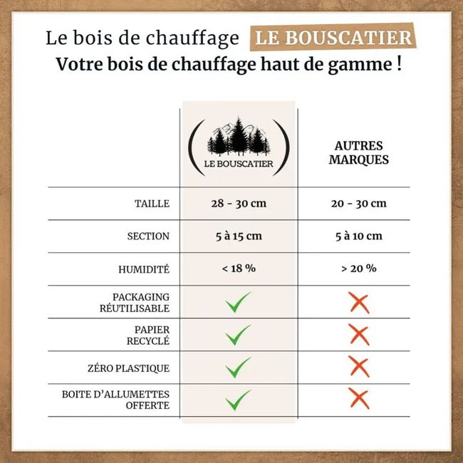 - Combustion régulière et longue grâce aux essences feuillues denses (chêne, hêtre, châtaignier).
