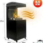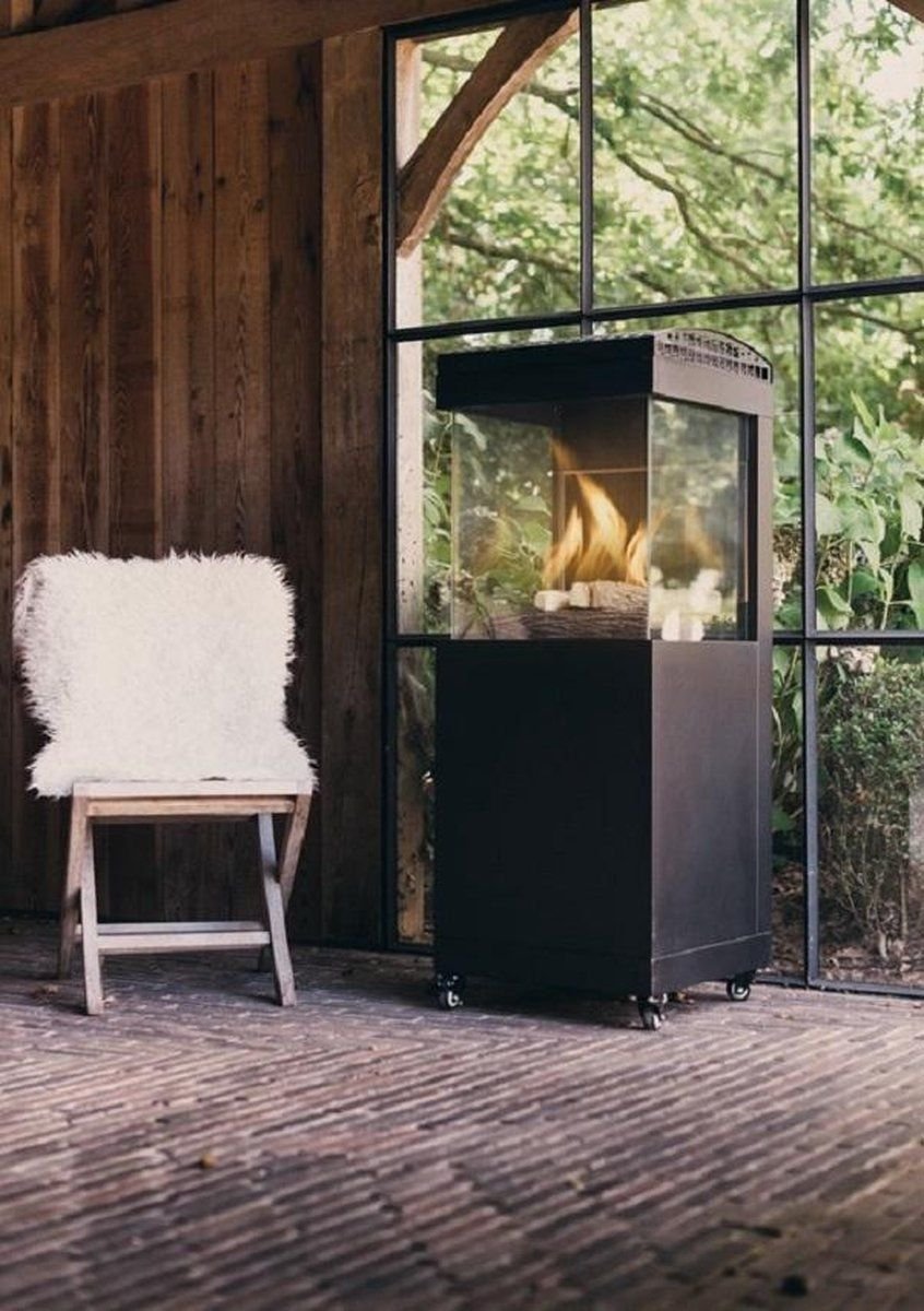 Chauffe-terrasse Malaga 9 kW : foyer extérieur à gaz, acier inoxydable noir, H135×L50×P50 cm, roues intégrées. Livraison avec couvercle offert et garantie 2 ans.