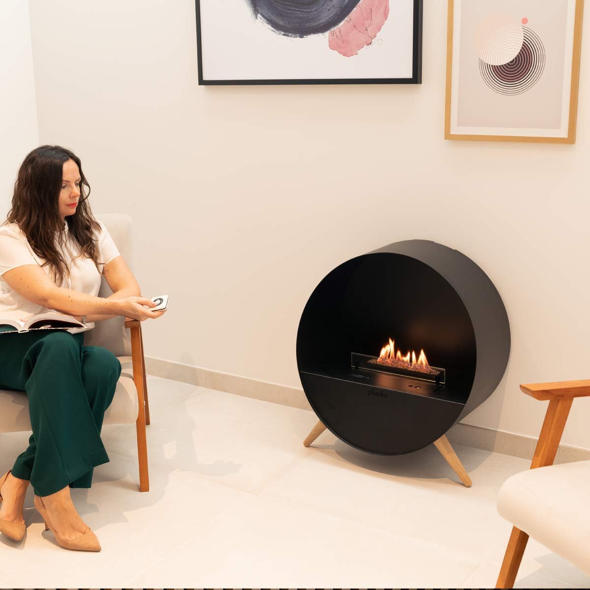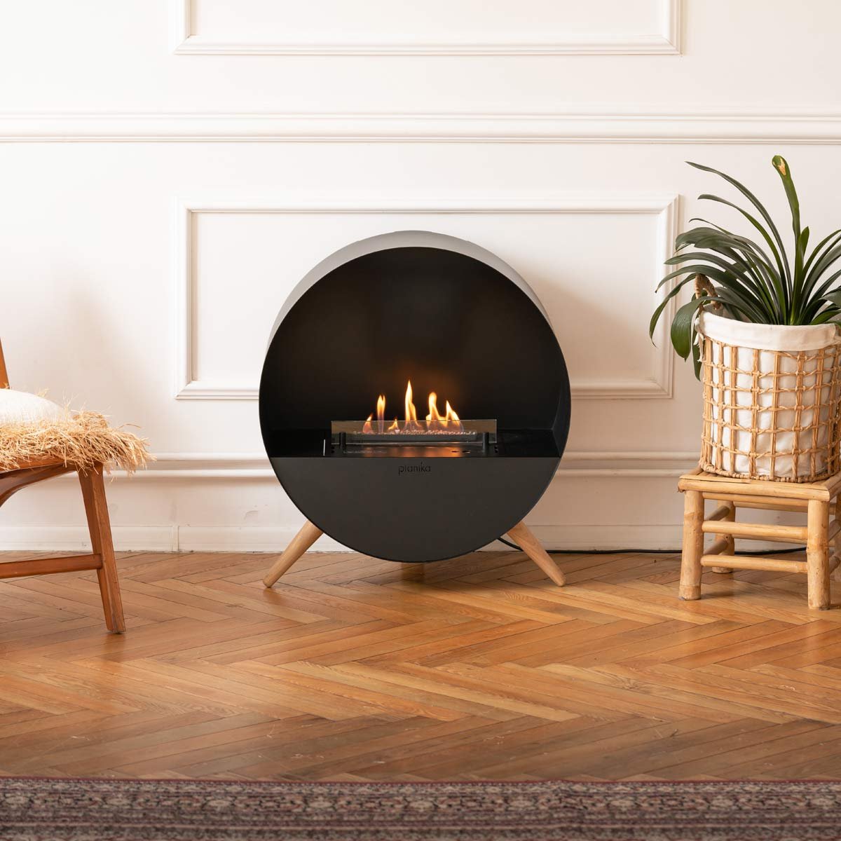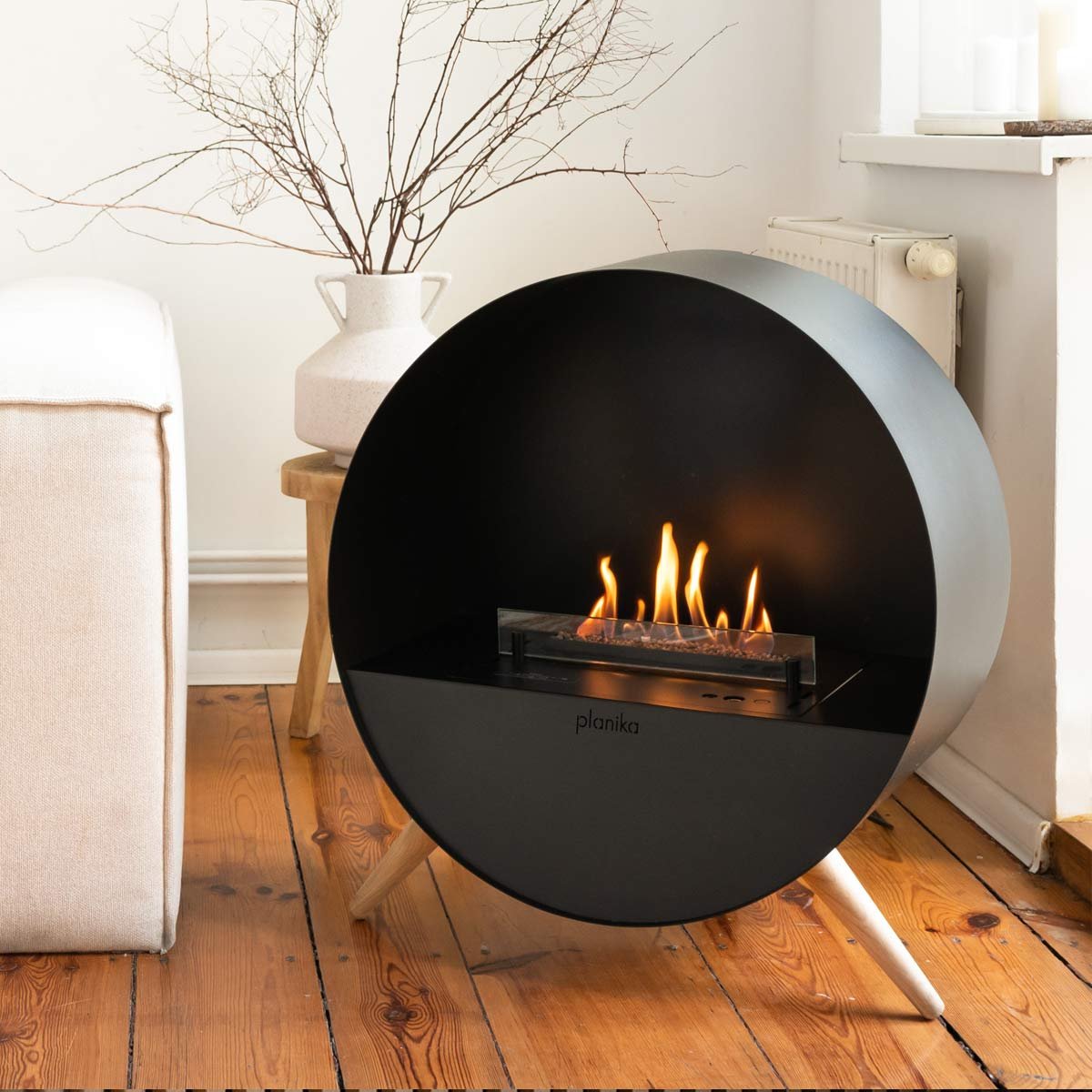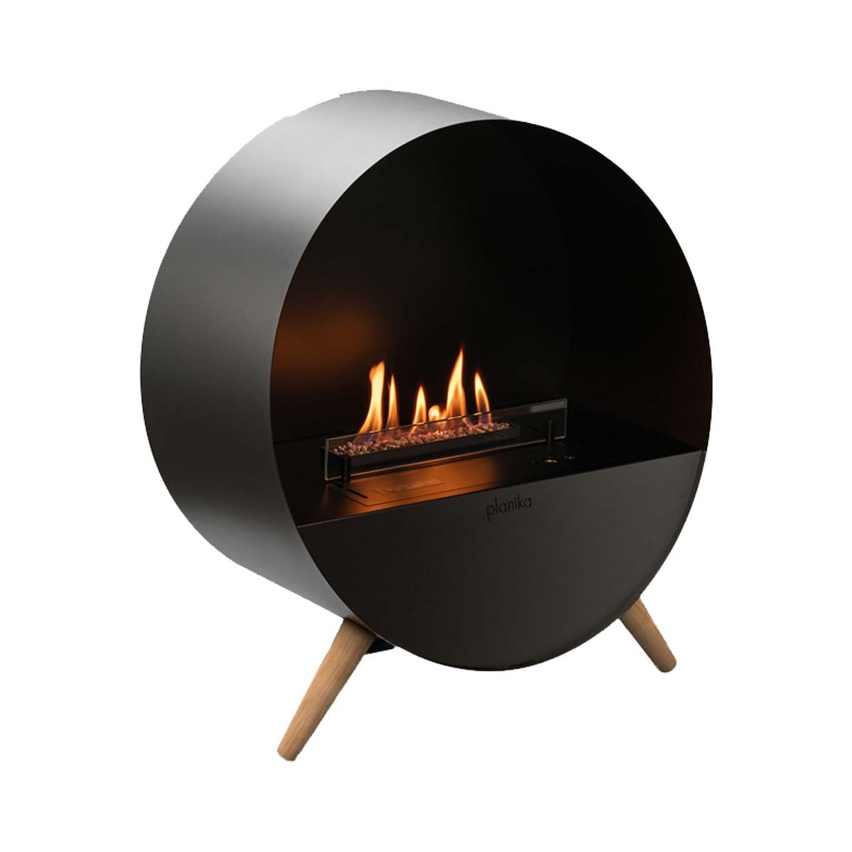 Bubble Floor de Planika est une cheminée bioéthanol ronde et élégante qui repose sur des pieds en bois de chêne. Conçue pour être installée facilement dans n’importe quelle pièce, elle présente une belle finition en acier noir mat qui crée un contraste profond avec les flammes dansantes sur son leur lit de billes en céramique. La cheminée est équipée d’une vitre de protection en verre trempé qui s’interpose entre les flammes et l’observation, et d’une télécommande qui permet de régler l’intensité des flammes selon deux hauteurs différentes.