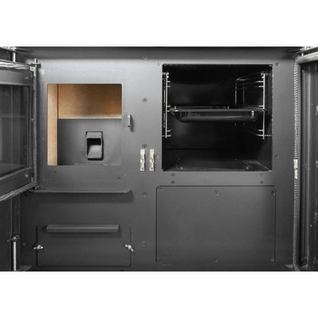 La particularité de cette cuisinière est d’offrir une double fonction : chauffage et cuisson. Le four (thermomètre intégré dans la vitre) et les plaques de cuisson permettent de cuisiner comme sur une cuisinière classique tout en bénéficiant de la chaleur du foyer. Idéale pour les familles qui veulent combiner confort thermique et plaisir culinaire.