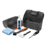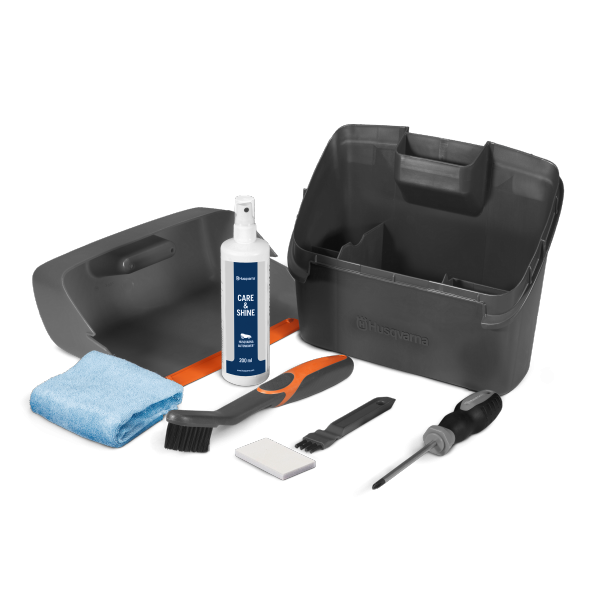 Le kit d’entretien Automower® contient: deux brosses ; une raide et l’autre souple ; d’un racloir permettant d’enlever la terre ; d’un tournevis afin de faciliter le changement des lames; et d’un spray assurant le nettoyage de la coque tout en la faisant briller.